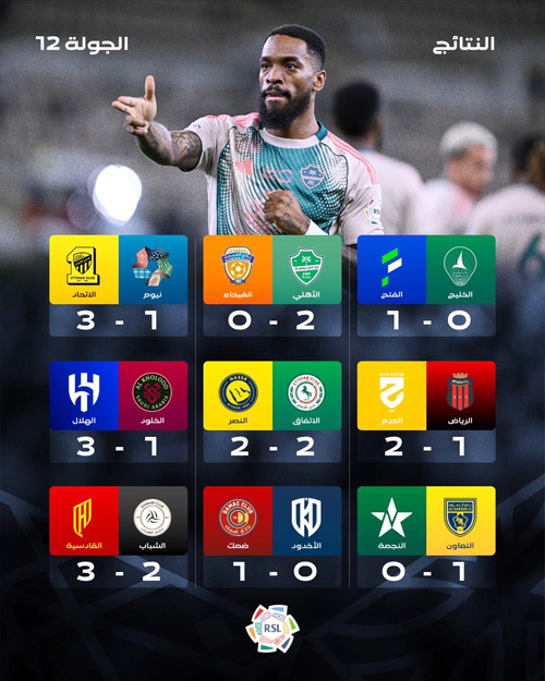 في ختام الجولة الـ12 من الدوري جرت أمس ثلاث مباريات انتهت جلها بثلاثيات ضد المستضيفين، ففي تبوك نجح الاتحاد بتجاوز نيوم ب1/3 وفي بريدة اقترب الهلال من المتصدر حين فاز على الخلود ب1/3، وفي الرياض فاز القادسية على الشباب بـ2/3.