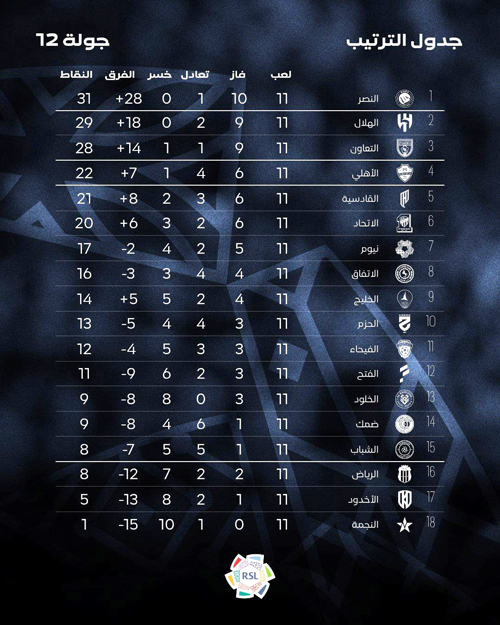 رفع فريق الهلال رصيده الى 29 نقطة في وصافة ترتيب دوري روشن مواصلا مزاحمته للمتصدر بفارق نقطتين، وذلك بعد أن حقق مساء أمس الفوز بثلاثية مقابل هدف واحد في المباراة التي جمعت الفريقين على استاد مدينة الملك عبدالله في بريدة جاءت أهداف المباراة عن طريق سافيتش وثيو هيرنانديز «هدفين» وللخلود انريكي من جزائية، وكان الشوط الأول قد انتهى بالتعادل بهدف لكل منهما.