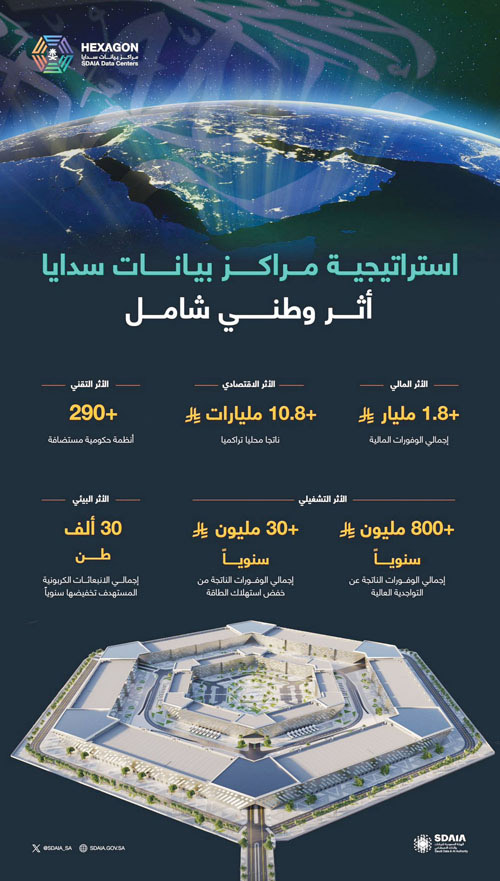 وُضع الخميس حجر الأساس لإنشاء مركز بيانات سدايا «هيكساجون» الذي يعد أكبر مركز بيانات حكومي في العالم مصنف Tier IV، ويمتلك أعلى مستوى تصنيف لمراكز البيانات حسب معهد الجهوزية العالمي «Uptime Institute»، بطاقة استيعابية إجمالية تقدر بـ480 ميجاواط، وسيتم إنشاؤه على مساحة تتجاوز 30 مليون قدم مربع بمدينة الرياض، وصُمم وفق أعلى المعايير العالمية، لتوفير أعلى درجات التواجدية والأمان والجاهزية التشغيلية لمراكز البيانات الحكومية، وتلبية متطلبات الجهات وتنامي الاعتمادية على الخدمات الإلكترونية، بما يُسهم في تعزيز الاقتصاد الوطني، ودعم مكانة المملكة بوصفها لاعبًا رئيسًا في مستقبل الاقتصاد الرقمي العالمي.