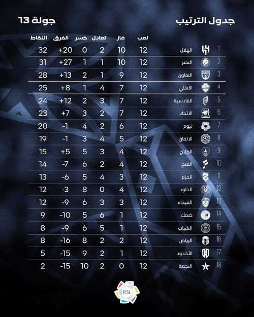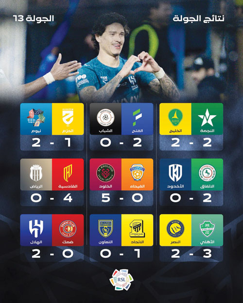 في ختام الجولة الـ13 من الدوري جرت أمس ثلاث مباريات، ففي الرس خسر الحزم من نيوم 2/1، وفي الدمام فاز القادسية على الرياض بـ0/4، وفي أبها قادت جماهيركبير الدوري فريقها للانتصار وانتزاع صدارة الدوري بعد أن تحول الملعب إلى أمواج زرقاء لينتصر الزعيم العالمي على ضمك بهدفي نونيز وليوناردو دون مقابل لفارس الجنوب.