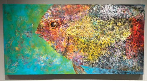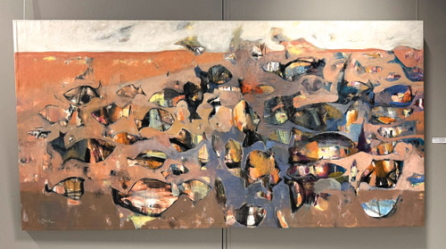 أما الفنانة مهدية آل طالب فتتخذ من الكائن البحري، وتحديدًا السمكة، محورًا بصريًا لأعمالها، مقدّمة معالجة تجمع بين التشخيص والتجريد. يظهر الكائن في مواجهة فراغ أزرق واسع، محمّل بسطح لوني غني بالملمس، نتج عن تقنيات التراكم والخدش والبناء الطبقي. وتتحوّل عين السمكة إلى بؤرة تعبيرية لافتة، توحي بالمراقبة واليقظة أو حتى الاضطراب والخوف، وكأنها مرآة لعلاقة الإنسان بالبحر. ويتقاطع الأزرق الفيروزي مع ألوان دافئة كالذهبي والأحمر، في تناغم يعكس حيوية الحياة البحرية وتحولاتها المستمرة.