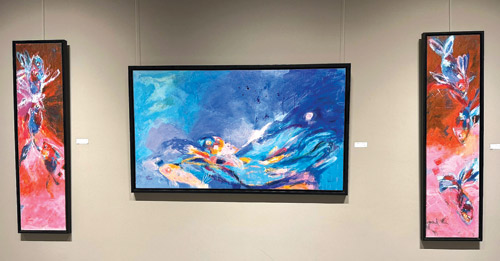 وتقدّم الفنانة عقيلة الصاخن مقاربة تعبيرية تجريدية للبحر، لا بوصفه مشهدًا بصريًا، بل كحالة شعورية متحوّلة، تتجسّد عبر حركة اللون وضربات الفرشاة الحرة. تنطلق أعمالها من الأزرق باعتباره فضاءً نفسيًا وذاكرة سائلة، حيث تتدفّق الكتل اللونية في مسارات غير مستقرة، توحي بالتيه والتحوّل والصراع الداخلي. ويتجاور الأزرق العميق مع ومضات لونية دافئة، في تباين بصري يخلق توترًا مقصودًا بين الهدوء والاضطراب.
