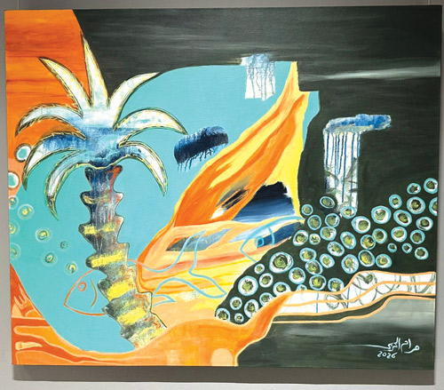 في حين تميل مرام عودة إلى بناء سرد بصري رمزي، تمزج فيه بين عناصر البحر واليابسة، مستحضرة مفردات مثل النخلة، الأسماك، والتيارات اللونية المتدفقة. يقوم عملها على تباين لوني جريء بين الأزرق والبرتقالي والأسود، في إيقاع بصري يعكس جدلية السكون والحركة.