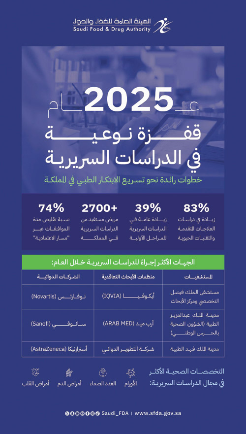 سجّلت المملكة نموًا قياسيًا بنسبة 83 في المائة في عدد الدراسات السريرية المقدّمة للتسجيل لدى الهيئة العامة للغذاء والدواء على المستحضرات البحثية في مجالات العلاجات المتقدمة والتقنيات الحيوية خلال عام 2025، مقارنةً بالعام السابق، إلى جانب زيادة بنسبة 39 في المائة في الدراسات السريرية للمراحل الأولية بشكل عام.