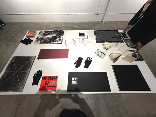 طريقة العرض تعزّز هذا الفهم فالكتب لا تُعلّق على الجدران بل تُعرض على طاولات طويلة في مستوى يسمح بالمواجهة المباشرة، المتلقي لا يقف أمام العمل بوصفه صورة بل يتحرّك حوله يغيّر زاوية النظر ويتعامل مع الصفحة كمساحة ثلاثية الأبعاد، القفازات الموضوعة بجانب الأعمال ليست تفصيلاً شكلياً بل تذكير بأن اللمس حاضر حتى حين يكون مؤجّلاً وأن الجسد جزء أساسي من تجربة التلقي.