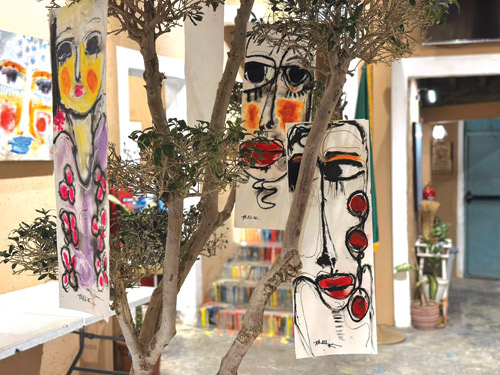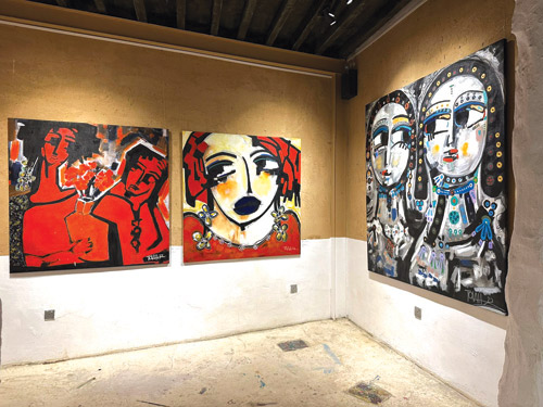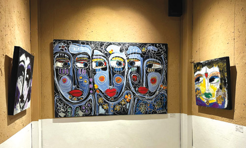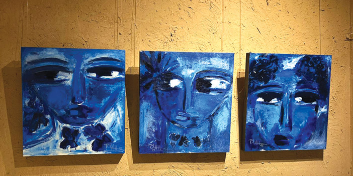 في هذا الفضاء الفني، تغدو الوجوه خرائط شعورية؛ فلا تُرسم الملامح بحدود صارمة، بل تتشكل من خلال شبكة من الخطوط البيضاء أو السوداء التي تدور وتلتف لتخلق العيون والأنف والفم، مانحة الشخوص طاقة حركية وكأنها في حالة قلق أو تساؤل دائم. وتلعب الألوان دور البطولة في هذا السرد البصري، فنجد وجوهاً غارقة في درجات الأزرق العميق، تأخذ المتلقي إلى عوالم من السكينة أو ربما العزلة الشجنية، بينما تشتعل لوحات أخرى بالأحمر الصريح لتعبر عن توهج العاطفة والحياة. وفي زاوية أخرى، تتجرد بعض الأعمال من اللون لتكتفي بصراع الأبيض والأسود، مقدمة وجوهاً تطاولت ملامحها لتبدو كأقنعة درامية تكتم أسراراً دفينة.