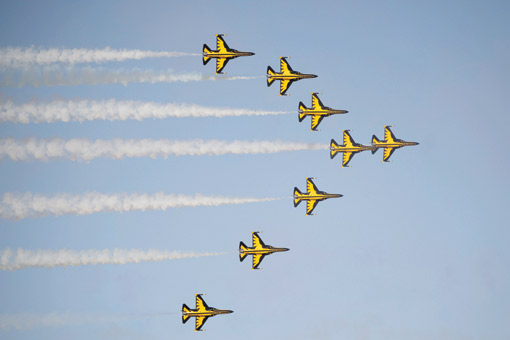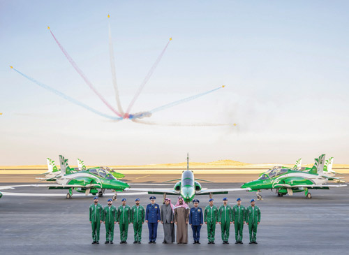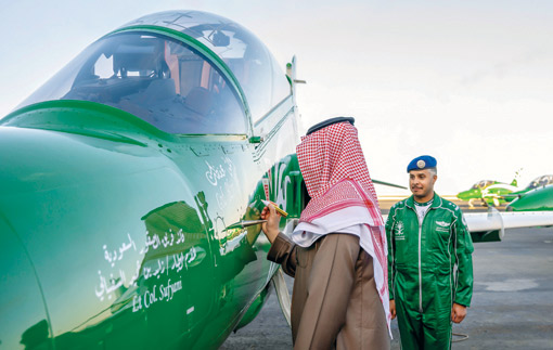 ثم توجه سموه إلى المنطقة الجوية، حيث التُقطت صورة تذكارية لسموه مع فريق الصقور السعودية، كما وقًّع على طائرة «هوك تي 165».