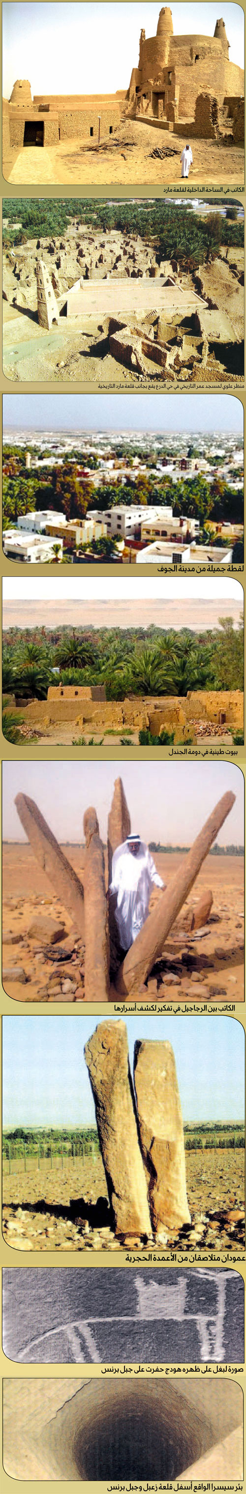 أمضى الباحث في الجوف وقتاً ممتعاً، لأنه وجد أهلاً ووطأ سهلاً ويفتخر كثيراً بأن منطقة الجوف ومحافظاتها جزءٌ ثمين من الوطن الغالي، وكل أرجاء الوطن عزيزةٌ غالية، وقد تميّز أهلها بالخلق الرفيع والكرم الأصيل حسب الواقع الذي عايشه الكاتب، كما تميّزت أرضها بإرثها الحضاري حيث دومة الجندل، ومسجد عمر بن الخطاب رضي الله عنه، وحي الدرع، وسوق دومة الجندل، وقلعة مارد، وحصن زعبل، وبئر سيسرا، وهناك موقعٌ قريب من سكاكا، لافتٌ للنظر، مثيرٌ للدهشة، ذلك لأنه يتكوّن من مجموعة، بل من مجموعات من الأعمدة الحجرية، وبابها محطم للأسف، وتلك المجموعات واقفة على الأرض تشبه من بعيد مجموعة من الرجال، لذا يطلق عليها أحياناً أعمدة الرجاجيل (وهي تسمية شعبية)، وتتكون إما من عمودين، أو ثلاثة أعمدة، أو أربعة، والغريب لا توجد حولها جبال وإنما تلال رملية ناعمة، زارها الكاتب تلك التلال وكانت آية في الجمال، وقد اصطفّت تلك الأعمدة في موقع واحد يشبه المستطيل، يصل طوله أكثر من 500 متر، كما يقدرها الباحث وعرضها في حدود 400متر تقريباً تزيد أو تنقص، ومن يدقق النظر في العمود أو الأعمدة يجد نقوشاً ورسوماً ثمودية، كما يجد بعض الإشارات المختلفة، يقول بعض أهالي تلك المنطقة بأنها تشيرُ إلى مجموعة من الكنوز، لذا لا يستغرب الزائر وجود حفر متعددة حول تلك الأعمدة بحثاً عن الكنوز المزعومة، وتذكر المعلومات المسجلة عن تلك الأعمدة بأنه قد تم تنفيذ أعمال حفر وإزالة بعض الطبقات الرملية حول تلك الصخور، ووُجِدت ألواح كبيرة من الحجر الرملي استندت على طبقة من الرمال الحمراء مع عدم وجود دليل للحفر لوضع أساسات لتلك الألواح أي: أنها ربّما تشكلت طبيعياً، ويعتبر موقع الأعمدة الحجرية - حسب رأي الكاتب - أهم المواقع السياحية في منطقة الجوف، لأنـها تثير الكثير من الأسئلة مثل: متى نشأت؟، وهل هي بطبيعتها هكذا عند نشوئها أم هي تدخل ضمن المنحوتات الصخرية؟ وعلى ماذا تدلّ؟ هل هي رمز للعبادة، أم تحديد منازل الشمس لاختلاف زوايا كل حجر منها؟ وهكذا تتعدد الأسئلة حولها ، ولكن المهم أنها مجالٌ مغرٍ لزيارتها والكتابة عنها لتأخذ موقعها في السياحة، علماً بأن منطقة الجوف بأكملها من أهمّ المناطق تاريخياً في وطننا الغالي.
