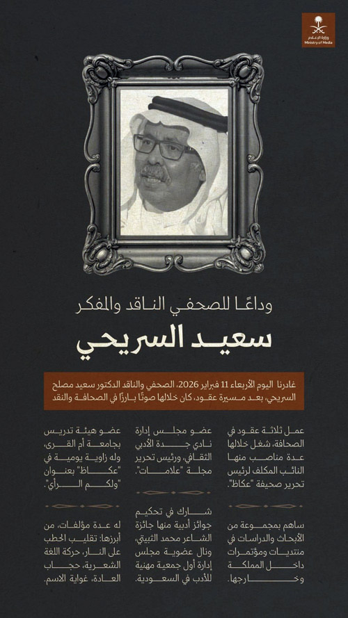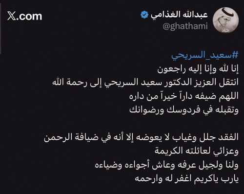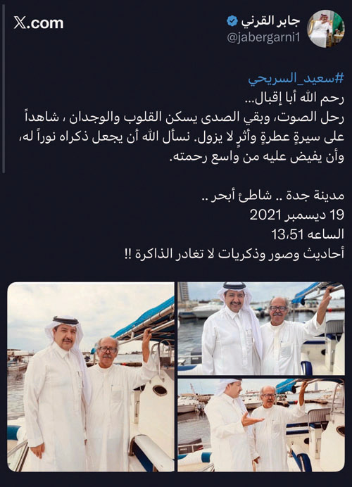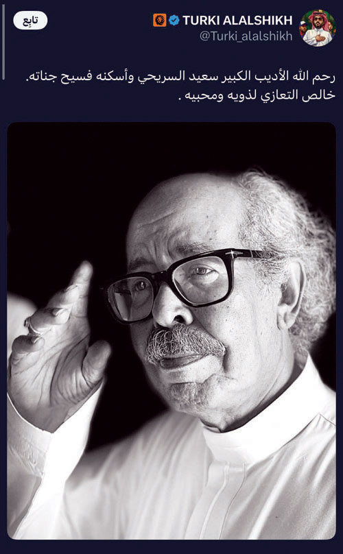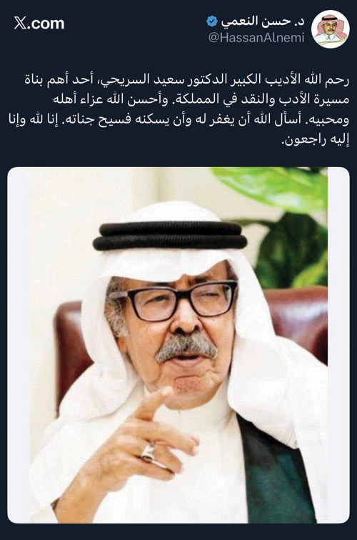 لقد ترك رحيل الأديب والناقد د.سعيد مصلح السريحي، أثرًا بالغًا في نفوس المثقفين والأدباء ورواد الكلمة، فكان من الأسماء المؤثرة في الساحة الثقافية السعودية، ويتجلى هذا التأثير من خلال عمله في التعليم لأكثر من عشرين عامًا، وقد امتد تأثيره إلى الأوساط الثقافية والفكرية، «الجزيرة الثقافية» تواصلت مع نجل الفقيد المهندس إقبال سعيد السريحي الذي نعى والده بقوله: «والدي مات حيًّا شامخًا، وأسأل الله العلي القدير أن يتغمده بواسع رحمته ورضوانه، وهو أعز عندنا من أن يفنى ذكره رحمه الله».