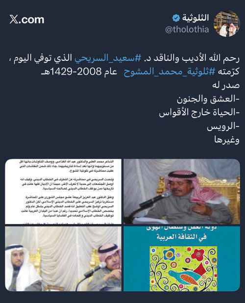 هذا ويمثل الأديب والناقد د.سعيد مصلح السريحي جيل روَّاد الأدب في المملكة وهو من أبرز أقطاب الصِّحافة فيها، فكان