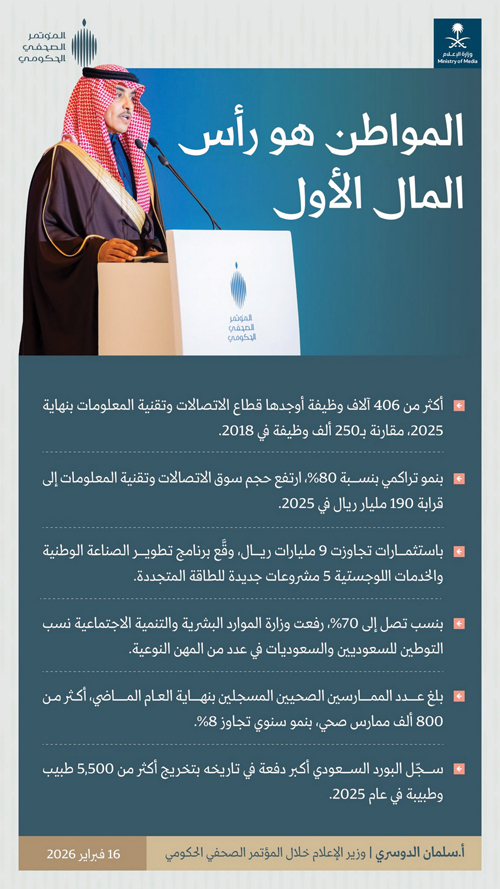 وأوضح أن قطاع الاتصالات وتقنية المعلومات أسهم في توفير 406 آلاف وظيفة بنهاية 2025 مقارنة بـ250 ألف وظيفة في عام 2018، فيما ارتفع حجم سوق الاتصالات وتقنية المعلومات إلى قرابة 190 مليار ريال في 2025، بنمو تراكمي بلغ 80%.