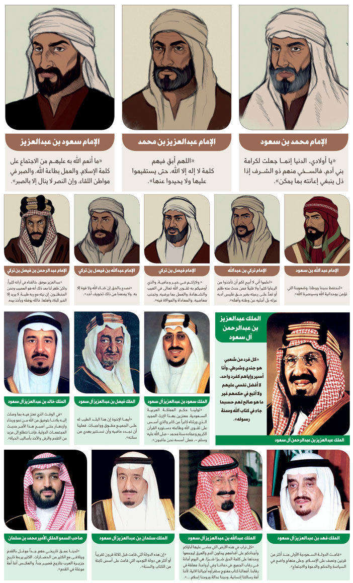 في يوم التأسيس الذي يصادف اليوم الـ22 من شهر فبراير نقف مع أقوال خلدها التاريخ لأئمة وقادة المملكة على مدى ثلاثة قرون، وذلك في عرض حسب التسلسل الزمني لحكم أولئك الأئمة الميامين منذ عهد المؤسس الإمام محمد بن سعود -رحمه الله - مروراً بأئمة الدولة السعودية الأولى ثم الدولة السعودية الثانية، إلى عهد مؤسس الدولة السعودية الحديثة الملك عبدالعزيز -طيب الله ثراه- الذي وحد جزيرة العرب تحت اسم «المملكة العربية السعودية» ليتولى الحكم من بعده أبناؤه الغر الميامين وصولاً إلى عهد خادم الحرمين الشريفين الملك سلمان بن عبدالعزيز وولي عهده الأمين صاحب السمو الملكي الأمير محمد بن سلمان بن عبدالعزيز -حفظهما الله ورعاهما-.