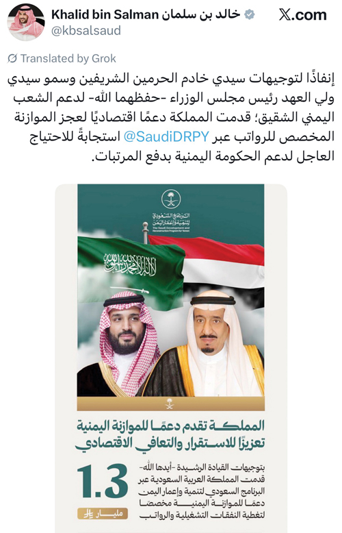 وقال صاحب السمو الملكي الأمير خالد بن سلمان بن عبدالعزيز وزير الدفاع في منشور على حسابه في منصة (X): «إنفاذا لتوجيهات سيدي خادم الحرمين الشريفين وسمو سيدي ولي العهد رئيس مجلس الوزراء -حفظهما الله- لدعم الشعب اليمني الشقيق ، قدمت المملكة دعماً اقتصادياً لعجز الموازنة المخصص للرواتب عبر البرنامج السعودي لتنمية وإعمار اليمن استجابة للاحتياج العاجل لدعم الحكومة اليمنية بدفع المرتبات».
