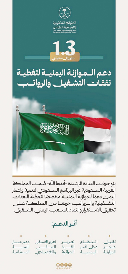 بتوجيهات القيادة الرشيدة -أيدها الله-، قدمت المملكة العربية السعودية عبر البرنامج السعودي لتنمية وإعمار اليمن دعمًا للموازنة اليمنية مخصصًا لتغطية النفقات التشغيلية والرواتب، البالغ إجماليه 1,3 مليار ريال سعودي، استجابة للاحتياجات العاجلة للحكومة اليمنية، وحرصًا من المملكة على تحقيق الاستقرار والنماء للشعب اليمني الشقيق.