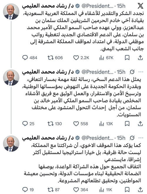 من جانبه رفع رئيس مجلس القيادة الرئاسي اليمني الدكتور رشاد العليمي، بالغ الشكر والتقدير لخادم الحرمين الشريفين وسمو ولي العهد -حفظهما الله-، على الدعم الاقتصادي الجديد لتغطية رواتب موظفي الدولة، في امتداد لمواقف المملكة المشرفة إلى جانب الشعب اليمني.وقال العليمي في منشور على حسابه في منصة (X): إن هذا الدعم السخي يمثل ثقة مهمة بمسار التعافي وبقدرة الحكومة الجديدة على النهوض بمؤسساتها الوطنية وترسيخ الأمن والاستقرار، والعمل الوثيق مع فريق الأشقاء المخلص بقيادة صاحب السمو الملكي الأمير خالد بن سلمان، من أجل إحداث التحول المنشود على مختلف المستويات.