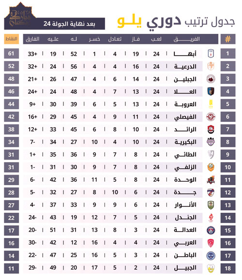 اختُتمت مباريات الجولة الرابعة والعشرين من دوري يلو لأندية الدرجة الأولى للمحترفين، في مواجهات شهدت نتائجها استمرار المنافسة في القمة واشتداد صراع الهروب من الهبوط، حيث حافظ أبها على صدارته رغم تعادله مع الأنوار، فيما حققت عدة فرق انتصارات مهمة غيّرت حسابات الوسط والقاع.