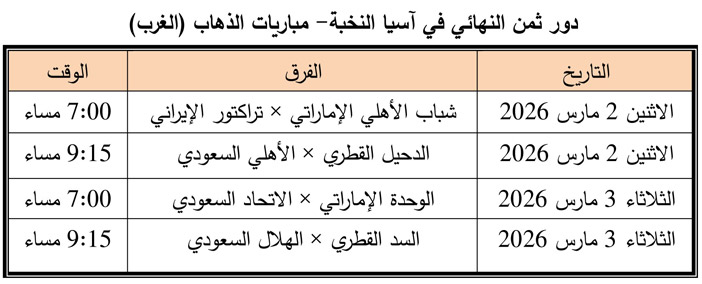 أعلن الاتحاد الآسيوي لكرة القدم، تأجيل مباريات الذهاب لدور الـ16 من دوري أبطال آسيا النخبة 2025- 2026 الخاصة بمنطقة الغرب، والتي كان من المقرر إقامتها يومي 2 و3 مارس الجاري، وذلك بسبب تطوّر الأوضاع في منطقة الشرق الأوسط.