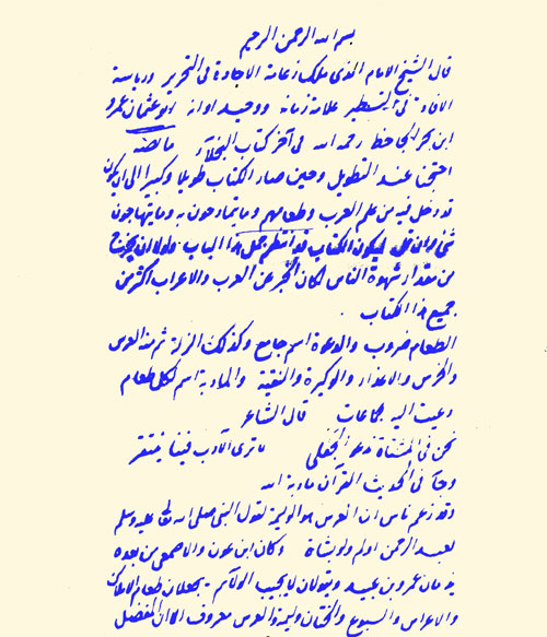 في عام 1323هـ 1905م نسخ العلامة محمود شكري الألوسي (ت 1924) بخط يده مقتطفات منتخبة مما ورد في كتب التراث عن أطعمة العرب قبل الإسلام. ابتدأها بأن نسخ القسم الأخير من كتاب «البخلاء» للجاحظ، وهو القسم الخاص بهذا الموضوع. فكتب قائلا: «بسم الله الرحمن الرحيم. قال الشيخ الإمام الذي ملك زعامة الإجادة في التحرير، ورياسة الإفادة في التسطير، علاّمة زمانه ووحيد أوانه، أبو عثمان عمرو بن بحر الجاحظ، في آخر كتاب البخلاء، ما نصّه: احتجنا عند التطويل وحين صار طويلاً كبيراً إلى أن يكون قد دخل فيه من علم العرب وطعامهم وما يتمادحون به وما يتهاجون به شيء وإن قل ليكون الكتاب قد انتظم جمل هذا الباب. ولولا أن يخرج من مقدار شهوة الناس لكان الخبر عن العرب والأعراب أكثر من جميع هذا الكتاب»[10].