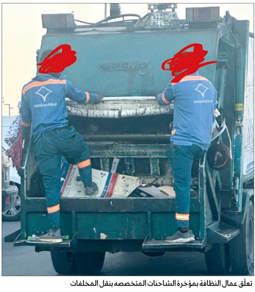 تعلّق عمال النظافة بمؤخرة الشاحنات المتخصصه بنقل المخلفات من أبرز الظواهر التي تتكرر داخل الأحياء السكنية قيام بعض عمال شاحنات جمع النفايات بالتعلق بمؤخرة المركبة أثناء سيرها.