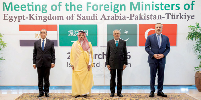 وقد شارك سمو وزير الخارجية أمس في الاجتماع الوزاري الرباعي الذي عقد في العاصمة الباكستانية إسلام آباد، بمشاركة معالي نائب رئيس الوزراء وزير خارجية جمهورية باكستان الإسلامية محمد إسحاق دار، ومعالي وزير الخارجية والتعاون الدولي والمصريين بالخارج بجمهورية مصر العربية الدكتور بدر عبدالعاطي، ومعالي وزير خارجية جمهورية تركيا هاكان فيدان.