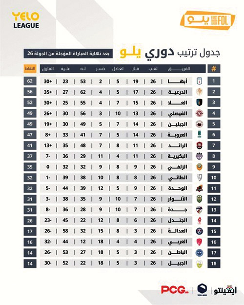 وبنهاية جميع المؤجلات، عزَّز أبها صدارته لجدول الترتيب برصيد (62) نقطة بفارق 6 نقاط عن الدرعية أقرب ملاحقيه الذي يحل في الوصافة برصيد (56) نقطة، ويأتي العلا ثالثًا برصيد (52) نقطة، والفيصلي رابعًا بـ(49) نقطة بفارق الأهداف عن الجبلين الذي يحل خامسًا، والعروبة في المركز السادس برصيد (47) نقطة, والرائد سابعًا بـ(41)، يليه البكيرية في المركز الثامن برصيد (37) نقطة، وتاسعًا الزلفي بـ(35) نقطة، وفي المركز العاشر يحل الطائي برصيد (32) نقطة، ثم الوحدة في المركز (11) بذات الرصيد، يليه الأنوار وجدة تواليًا ولكل منهم (31) نقطة، والجندل في المركز (14) برصيد (26) نقطة، ثم العدالة في المركز الخامس عشر بـ(17) نقطة، والعربي برصيد (16) نقطة في المركز السادس عشر، يليه الباطن بـ(14)، وأخيرًا الجبيل متذيل الترتيب برصيد (14) نقطة.