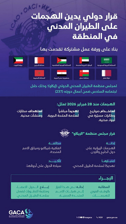 أصدر مجلس منظمة الطيران المدني الدولي (إيكاو)، خلال اجتماعه السادس ضمن أعمال دورته (237)، قرارًا يدين الهجمات التي تشنها إيران على عدد من دول المنطقة، وذلك بناءً على ورقة عمل مشتركة تقدمت بها المملكة العربية السعودية، والإمارات العربية المتحدة، والمملكة الأردنية الهاشمية، ومملكة البحرين، ودولة الكويت، ودولة قطر، وسلطنة عمان، وجمهورية مصر العربية، والمملكة المغربية، بتاريخ 19 مارس 2026م، في خطوة تعكس موقفًا دوليًا حازمًا تجاه التهديدات التي تمس سلامة وأمن الطيران المدني.