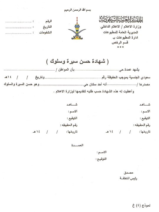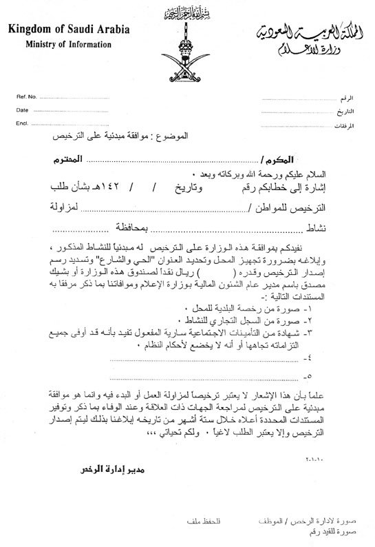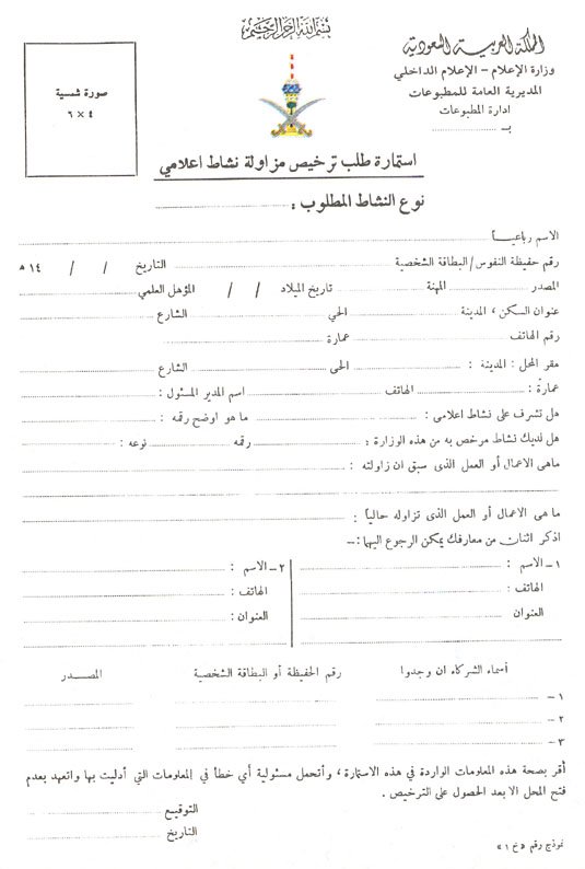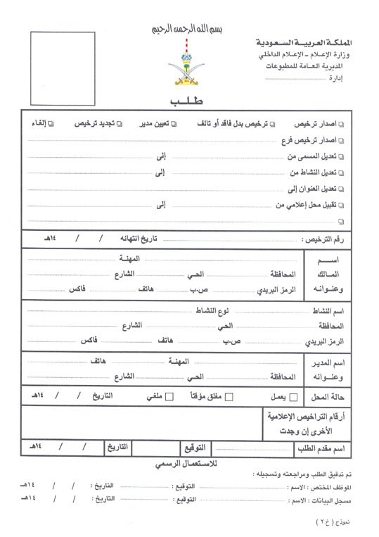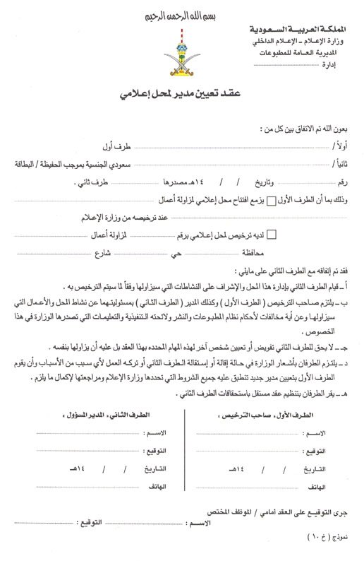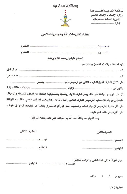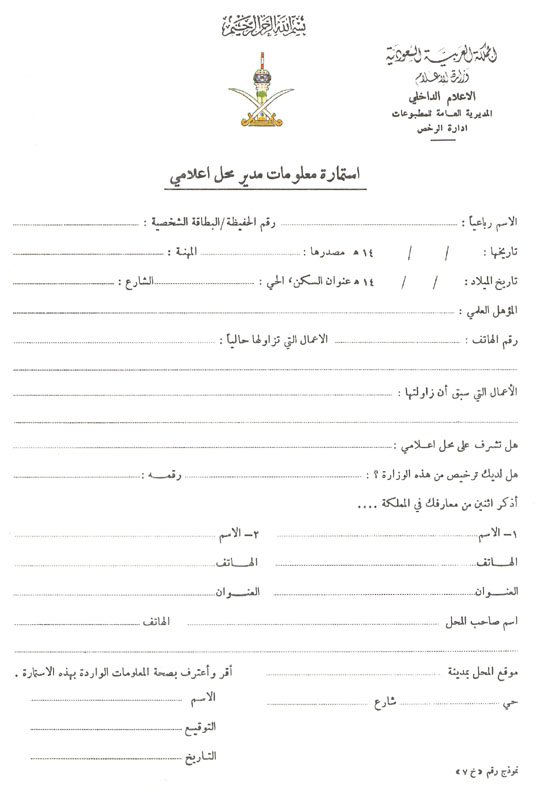 ثقافة وإعلام - إعلام - تراخيص إعلامية - النماذج المستخدمة في التراخيص 1 - نموذج طلب ترخيص 2 - نموذج شهادة حسن سيرة وسلوك 3 - استمارة طلب ترخيص مزاولة 4 - نموذج موافقة مبدئية 5 - استمارة معلومات مدير محل إعلامي 6 - عقد تعيين مدير لمحل إعلامي 7 - عقد نقل ملكية ترخيص إعلامي |