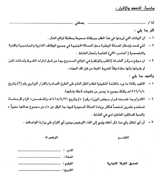 نقل ومواصلات - تراخيص - ممارسة نشاط الأجرة العامة - تجديد ترخيص تأجير سيارة صغيرة تعليمات عامة: يلزم أن يتقيد المتقدم بطلب تجديد الترخيص بما يلي: 1 - مراعاة الدقة في استيفاء المعلومات المطلوبة بهذا الطلب والتوقيع على كافة صفحاته وعلى أية أوراق إضافية وعلى أي كشط به. 2 - إرفاق المستندات التالية على أن تكون سارية المفعول: أ - صورة من السجل التجاري مضافاً به النشاط. ب - صورة من شهادة الانتساب للغرفة التجارية. جـ - شهادة تفيد الاشتراك بالمؤسسة العامة للتأمينات الاجتماعية. د - شهادة الزكاة والدخل. هـ - وثيقة التأمين على المركبات المستخدمة في النشاط صادرة من إحدى الشركات الوطنية المرخص لها في المملكة. و - صور رخص سير المركبات المستخدمة في النشاط. نمـــاذج الطلب 1 2 3 4 5 6 7 8 9 |