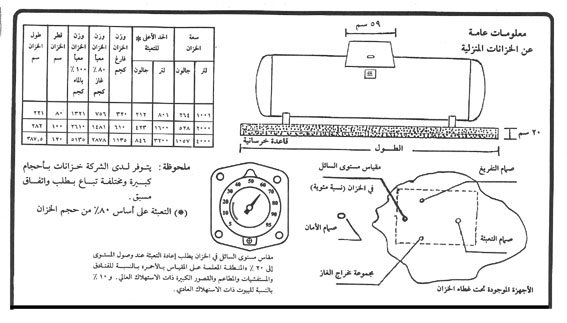 سجلات تجارية وتراخيص - تراخيص الخدمات العامة - شركة الغاز و التصنيع الأهليه - طريقة الاستعمال 1 - يجب التأكد من مستوى السائل في الخزان بين الحين والآخر بقراءة العداد الخاص به لضمان عدم انقطاع الغاز قبل إعادة التعبئة. 2 - عدم استعمال المواقد أو غيرها أثناء إعادة التعبئة. 3 - إذا كان الخزان مكشوفاً فيفضل رشه بالماء في أيام الصيف الشديدة الحرارة خصوصاً بعد إعادة التعبئة. 4 - إقفال الصمام الرئيسي عند الانتهاء من الاستعمال. 5 - السماح لسائق الشركة بإعادة التعبئة في أوقات النهار بعد التأكد من شخصيته. الرسم التوضيحي |