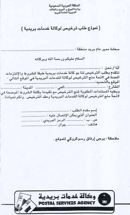 سجلات تجارية وتراخيص - تراخيص الخدمات العامة - الوكالات البريدية - نموذج طلب ترخيص وكالة خدمات بريدية